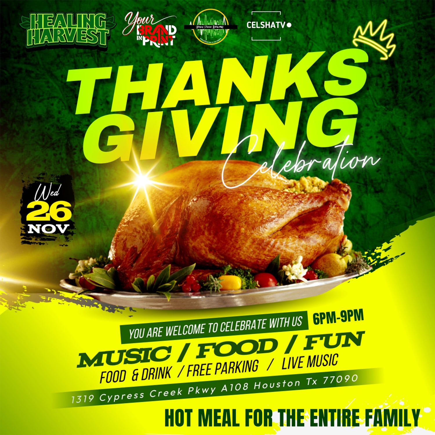 Come have a hot meal with us and our Healing harvest family! Wednesday Nov 26th at our 1319 Cypress Creek Pkwy A108, Houston, TX 77090 location from 6pm-9pm. Our menu for dinner Chicken, Turkey, greens, string beans, potatoes & gravy, salad and drinks! Healing Harvest will be giving out goodies for adults 21 and over! Register you and your family below!