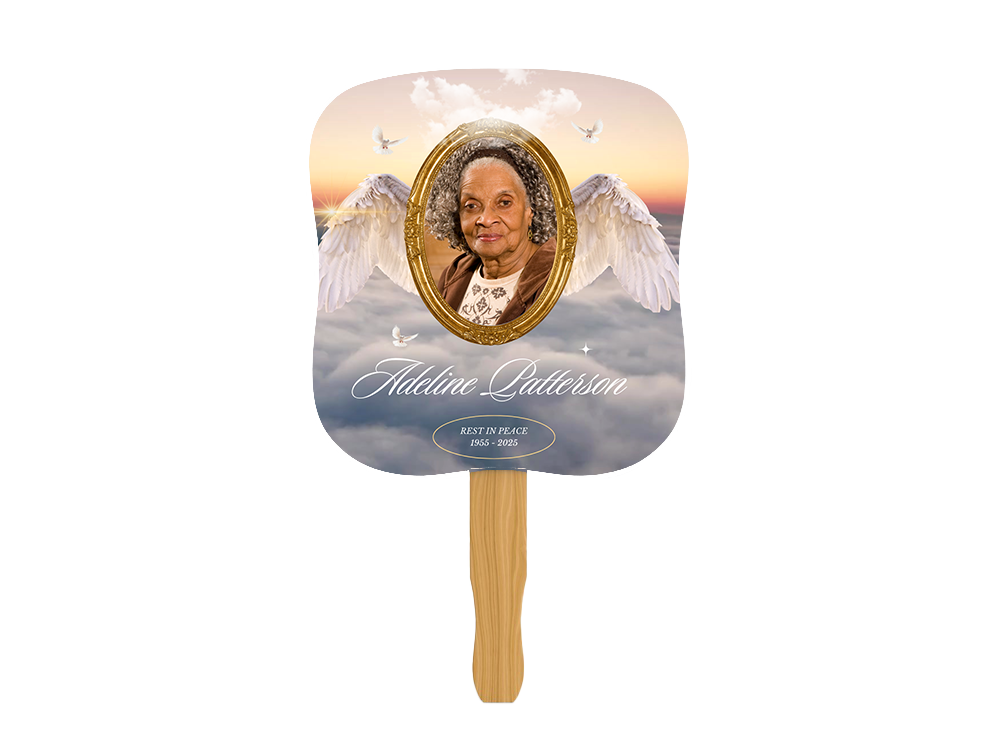 Memorial fans are typically a form of honoring a loved one's memory and are personalized with text and photo of the deceased.