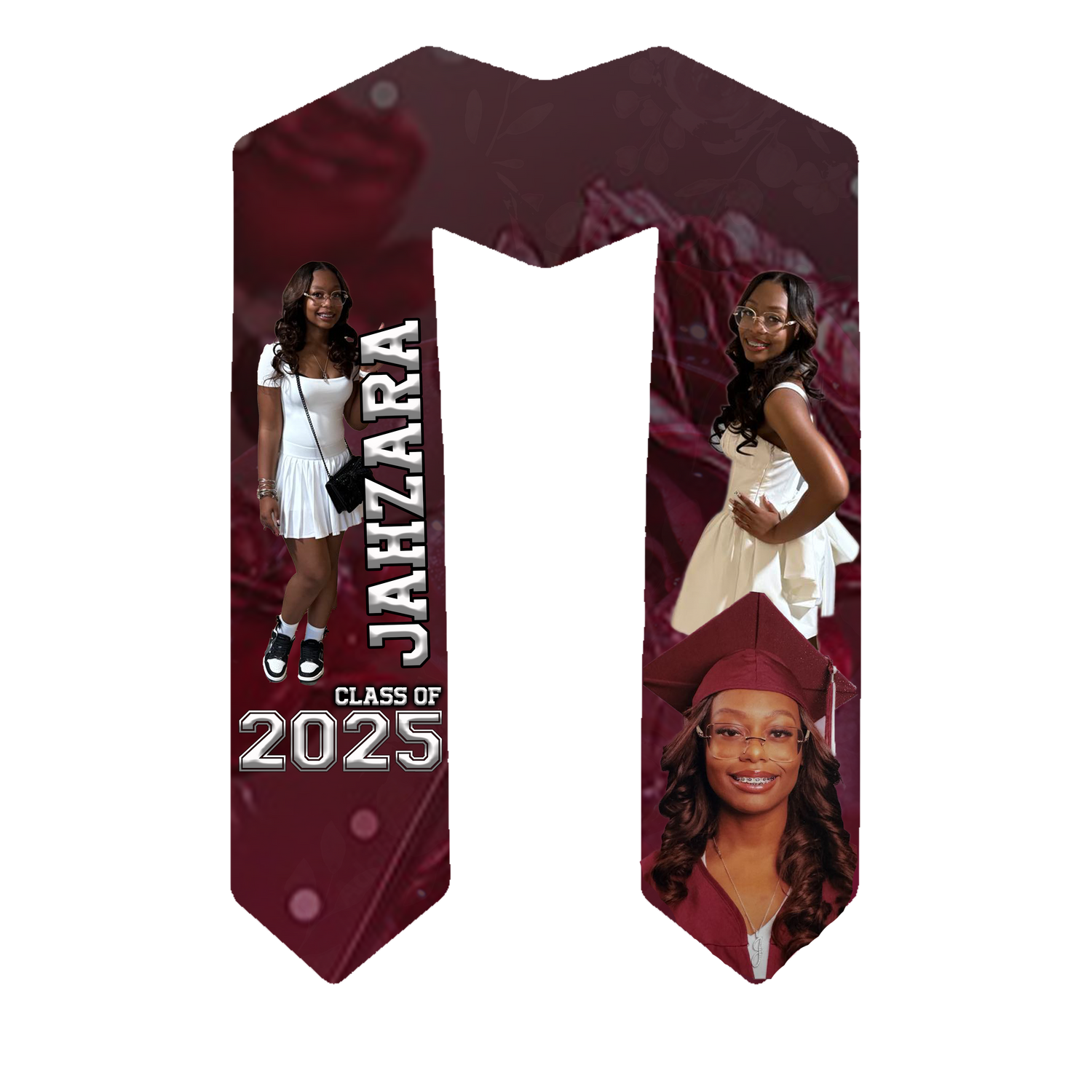 A "grad stole" isa decorative sash-like garment worn over the shoulders during a graduation ceremony, typically made of fabric like satin or silk, that signifies a graduate's academic achievements, extracurricular involvement, honors, or affiliations through its color and design, allowing graduates to personalize their graduation attire and showcase their unique accomplishments during commencement