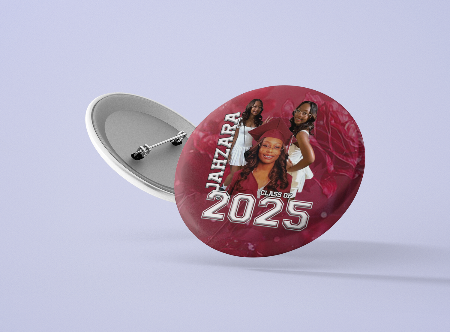 Also called button badges, these buttons can be attached to clothing, bags, or hats using a safety pin. They are often used to promote things or people.